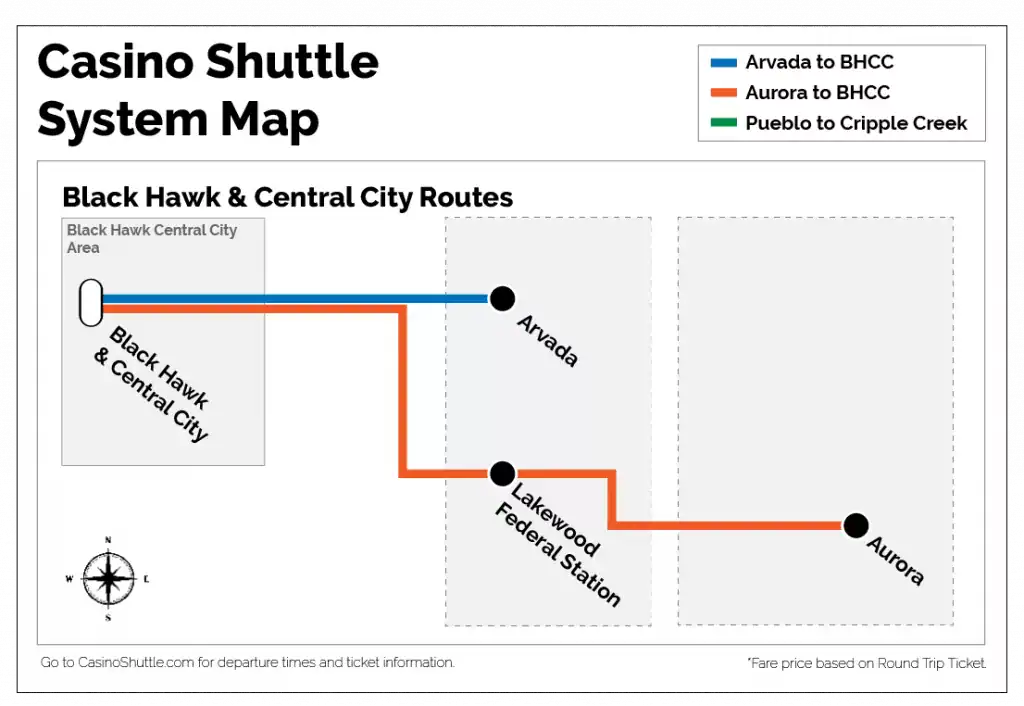 This casino shuttle bus route to Black Hawk and Central City departs from Arvada Marketplace.