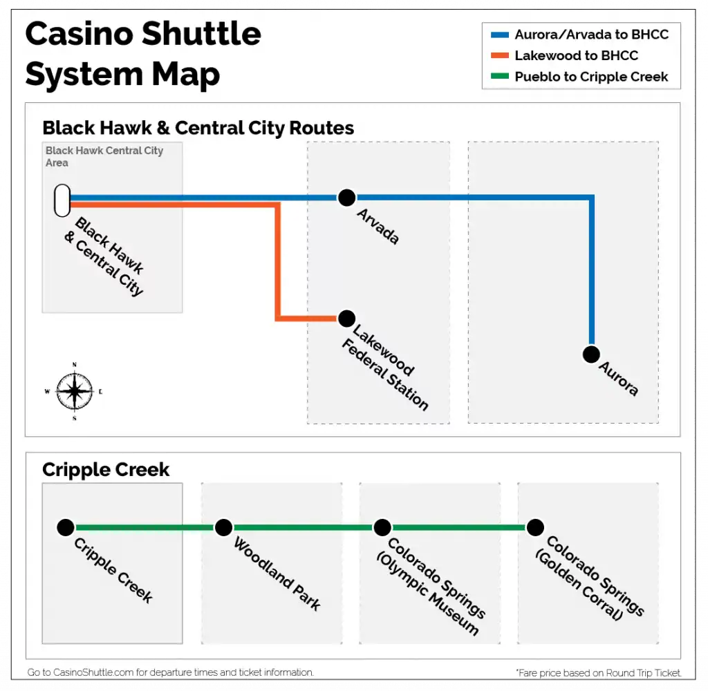 This Casino Shuttle bus route to Black Hawk and Central City goes through Aurora and Arvada.