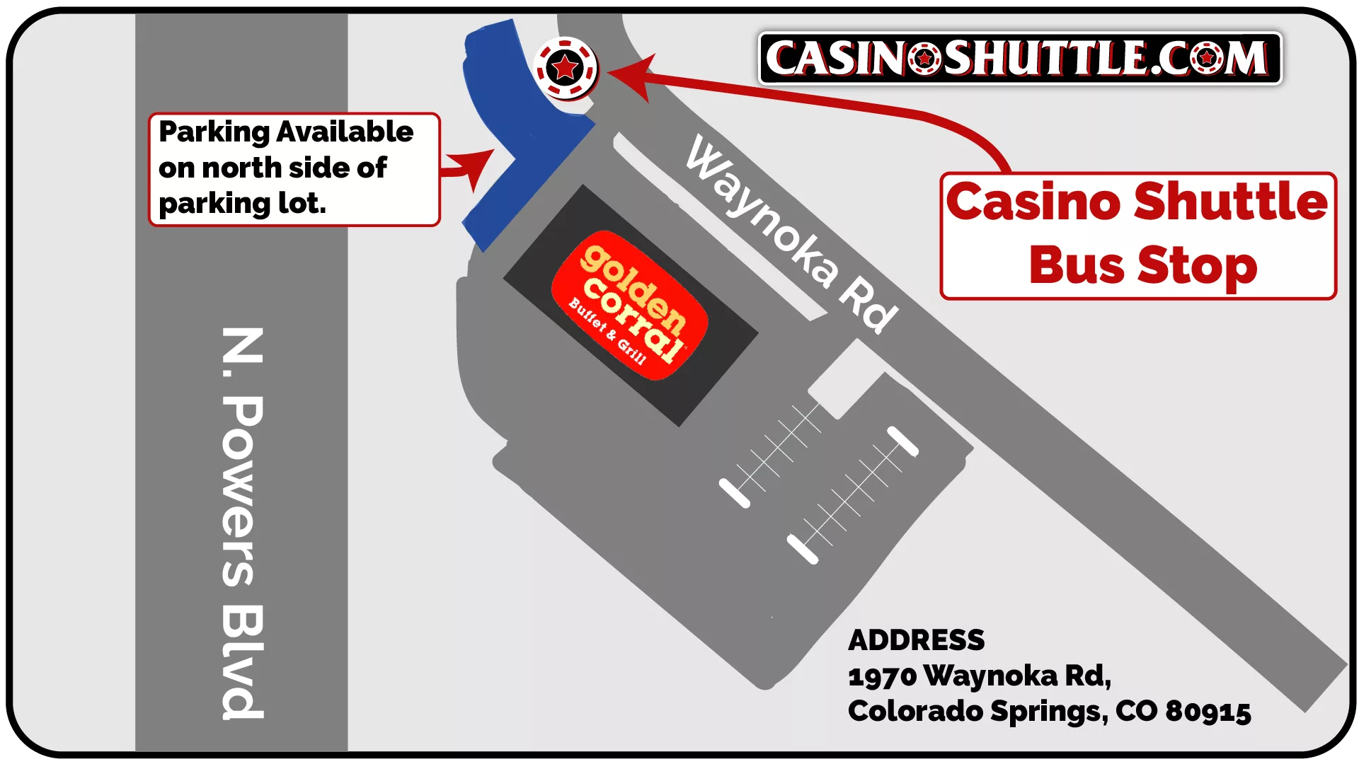 Parking: Free parking is available to CasinoShuttle riders on the north side of the parking lot. Scroll down to see bus stop map for details.