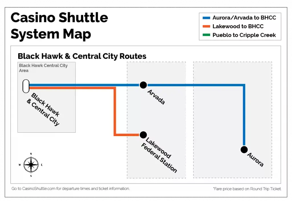 This casino shuttle bus route to Black Hawk and Central City departs from Lakewood (Federal Center).